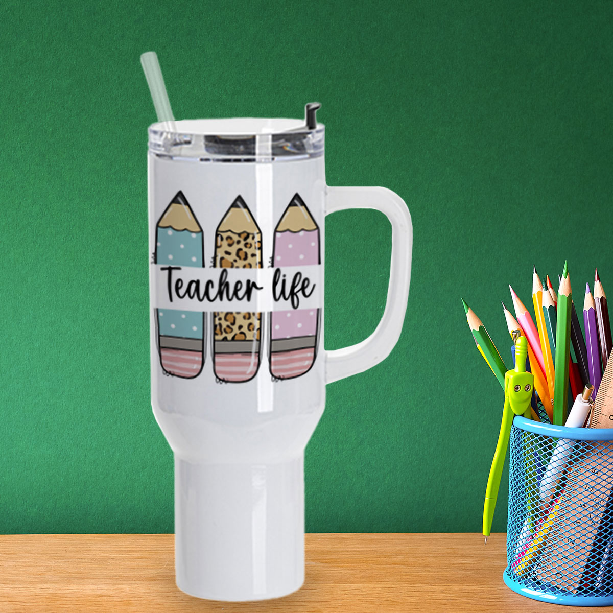This 40oz sublimation tumbler with handle is the perfect option to personalize for your busy, on-the-go customers! These tumblers are expertly engineered to keep fluids hot or cold for hours with their vacuum double-wall insulation and feature a trendy, popular look and design.