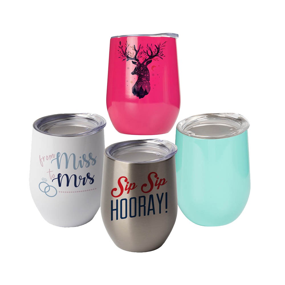 Let your customers’ clients or guests savor their favorite vino or beverage in 12 oz. customizable stainless steel stemless wine glasses. These sleek, modern glasses are available in a variety of colors and can be personalized with sublimation, toner heat transfer, or vinyl. They are designed to not only look good but to retain drink temperatures, due to double-wall vacuum insulation technology. These wine cups can be customized by imprinting a memorable photo, corporate logo, significant quote, or creative graphic.